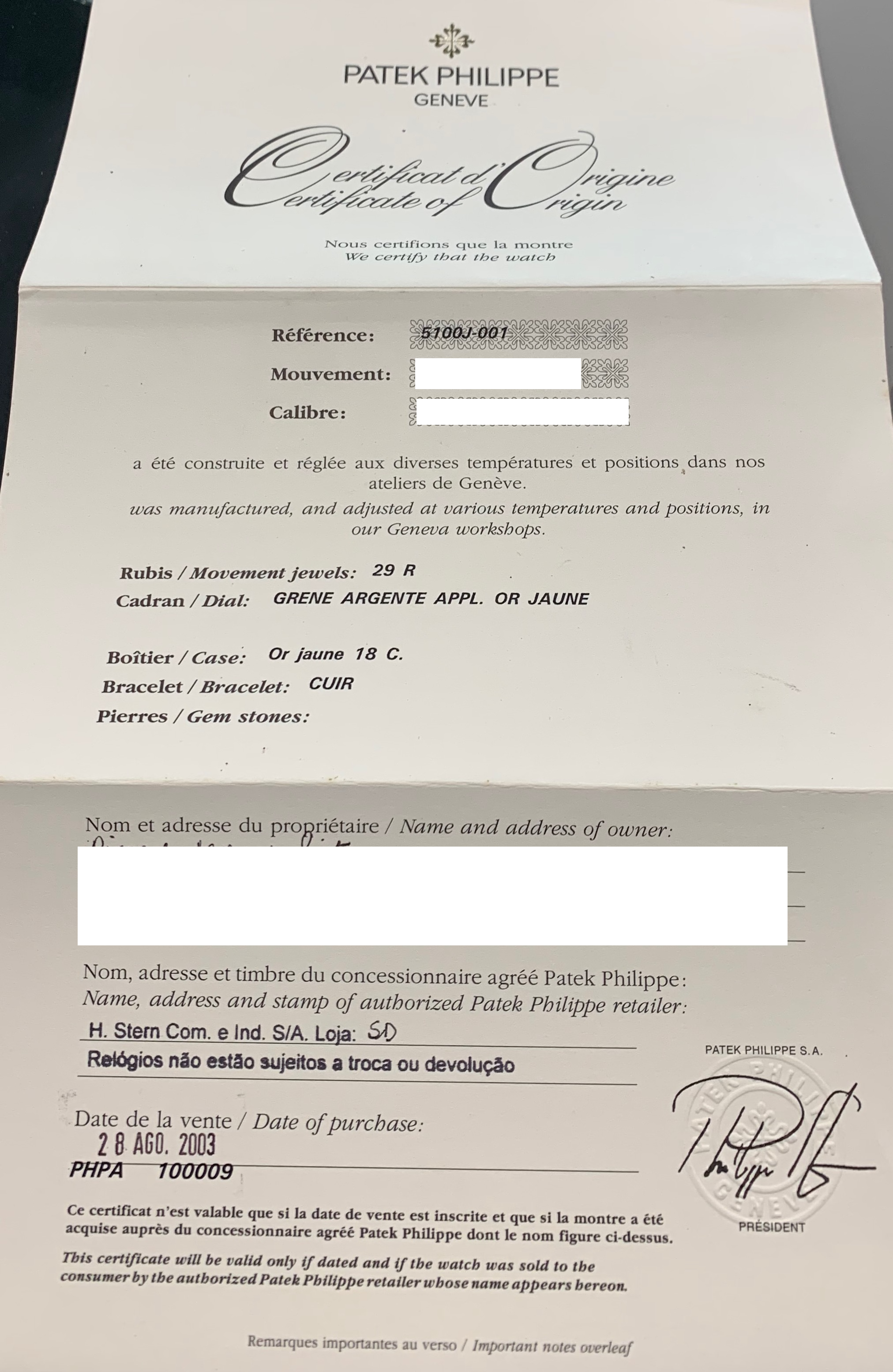 Lanciato nel 2000 e prodotto solo fino al 2003, il 5100J è oggi un’icona da collezione, ricercata per le sue linee art déco e la sua esclusività: solo 750 esemplari al mondo in oro giallo.